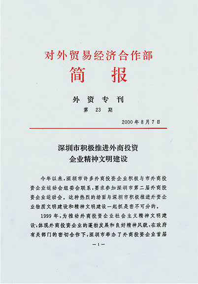 2000年8月,国家外经贸部印发简报,专门向中央政治局委员、中央财经领导小组、国务院总理、副总理、国务委员、秘书长、国务院办公厅、党中央和国务院有关部门,报告“深圳市积极推进外商投资企业精神文明建设”所取得的六个方面的“成效和启示”(见以上文件)。 并抄送各省、市、自治区人民政府、外经贸委(厅)、各国家级经济技术开发区,传播深圳利用外资中“两手抓、两手硬”的经验。