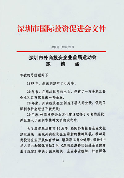 1999年夏,原深圳市委副书记、现广东省副省长李容根同志批示:"请有关部门给予支持协助",要求"外运会办得越活跃越好"。时任深圳市委副书记、市政府常务副市长、市政协主席李德成同志批示举办深圳市外商投资企业运动会,并担任了首届外运会组委会名誉主任。