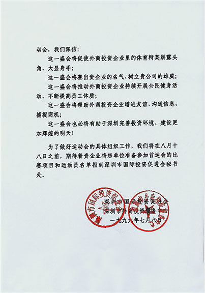 时任深圳市人大常委会副主任、市总工会主席张宝琴同志批示:"工会是广大职工的娘家,应大力支持办好外运会"。