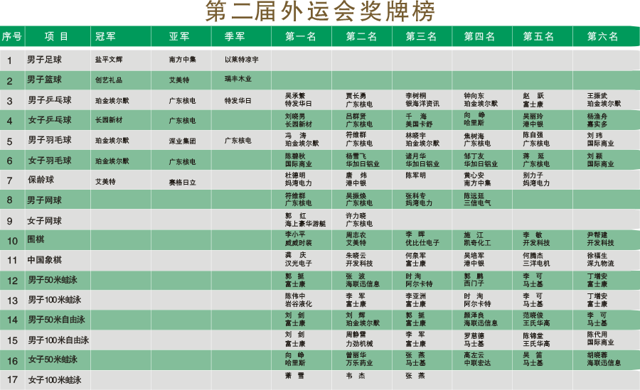 广东核电杯男子篮球赛、马士基杯羽毛球赛、歌力思杯乒乓球赛、盈信杯网球赛、华侨城杯保龄球赛、艾美特杯游泳赛