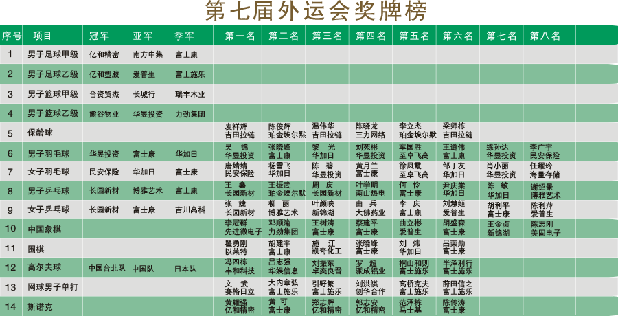 第七届外运会以扎根基层、促进企业员工健身为主题,将闭幕式设在富士康举办,各方面反映良好。