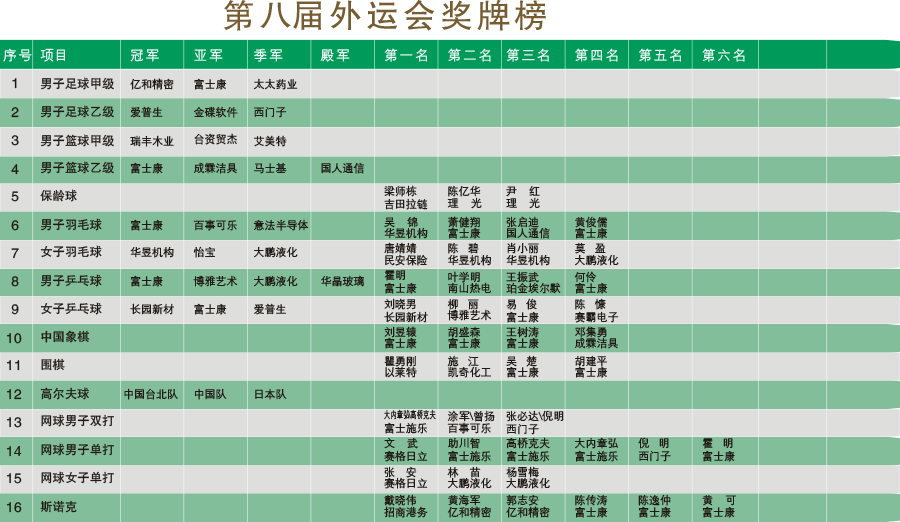 第八届外运会第一次启用总冠名单位,称"富士康杯深圳市第八届外商投资企业运动会",造就了双赢的局面。在开幕式上成功举办了外企韵律操大赛,获得企业的一致赞誉。
