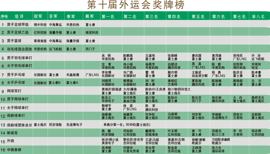 单项冠名:中航健身杯男子篮球赛、华昱杯羽毛球赛、艾美特杯乒乓球赛、亿和杯斯诺克赛、美固杯扑克升级赛